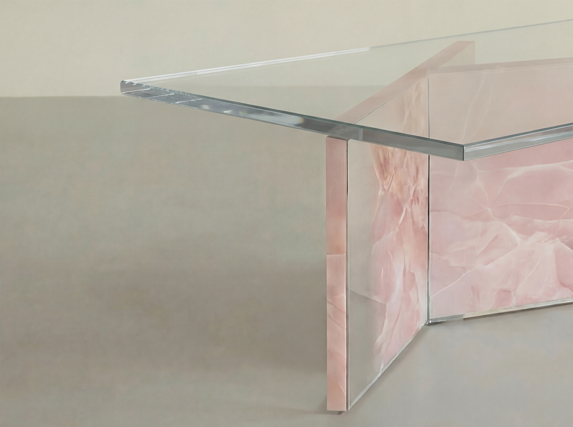 Materials: Solid Pink Onyx 20 mm, crystal clear glass with hand-applied custom mirror gradient finish, inox satin plate